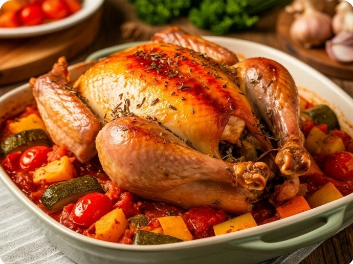 Запеченная индейка с овощами — это идеальное блюдо для диабетика: сбалансированное, богатое белком и клетчаткой, с низким гликемическим индексом. Вот пошаговый рецепт, разработанный с учетом рекомендаций по питанию при диабете. Этот рецепт фокусируется на использовании нежирного мяса, овощей с низким ГИ и полезных жиров. Время приготовления:15-20 минут подготовка + 45-60 минут запекание Порции:3-4 Ингредиенты: Для индейки: Филе индейки (грудка) — 500-600 г Лимонный сок— 2 ст. ложки Горчица дижонская (без сахара) — 1 ч. ложка (по желанию, для пикантности) Чеснок— 2-3 зубчика (измельчить) Оливковое масло первого отжима— 1 ст. ложка Сушеные травы:розмарин, тимьян, орегано — по ½ ч. ложки каждой Соль — по вкусу (умеренно) Свежемолотый черный перец — по вкусу Для овощей: Кабачок (цуккини)— 1 средний Болгарский перец — 2 шт. (разных цветов) Брокколи — 200 г Лук репчатый — 1 небольшая головка Спаржа (по сезону)— 100 г (по желанию) Оливковое масло — 1 ст. ложка Соль, перец, сушеные травы— щ