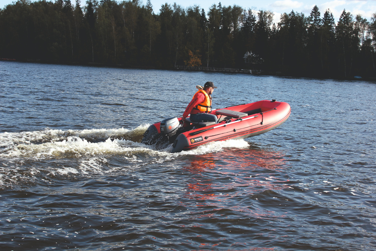 Даем ход. Впечатления от первого захода: плавный, бесстресовый разгон. Лодка не пытается «прыгнуть» из воды, а уверенно и постепенно начинает набирать скорость, выходя на режим глиссирования без малейших рывков. Это очень важно для новичков или для тех, кто перевозит хрупкое снаряжение.