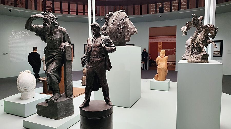 Эпическая, несмотря на небольшие размеры, картина Исаака Бродского «Передача знамени парижских коммунаров московским рабочим на Ходынке в Москве» (1924) соседствует с грандиозным полотном «Вождь, учитель и друг И.В. Сталин в президиуме II Съезда колхозников-ударников в феврале 1935 года» Григория Шегаля (кто сейчас вспомнит фамилию этого бывшего «бубнововалетовца»?). «Оттепельные» акварели Юрия Пименова вывешены напротив грандиозного горельефа Евгения Вучетича «Знаменосцу мира — советскому народу слава!» (1950–1954). Когда-то он украшал павильон «Центральный», но с наступлением «оттепели» был на долгие полвека спрятан от посетителей чиновниками от искусства. Один из корифеев советского монументального искусства, Евгений Викторович Вучетич тоже изобразил Москву, но фантазийную, с циклопическими (так и не построенными) высотками, небоскребами столицы победившего коммунизма. Такая вот получилась перекличка двух эпох, двух идеологий.