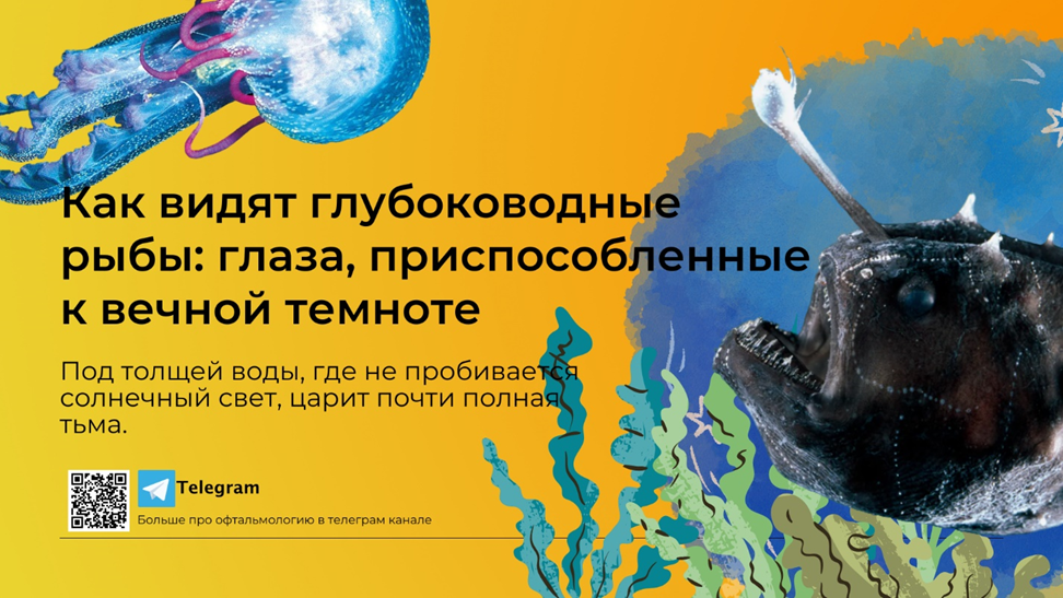 Их глаза приспособлены именно к этому: · Сетчатка насыщена палочковыми клетками, чувствительными к минимальному количеству фотонов. · Зрачки огромные, чтобы пропускать максимум света. · У некоторых видов (например, у чёрного дракона или телескопической рыбы) глаза направлены вверх - чтобы замечать слабое мерцание добычи над собой. Многие обитатели глубин не только видят свет - они сами