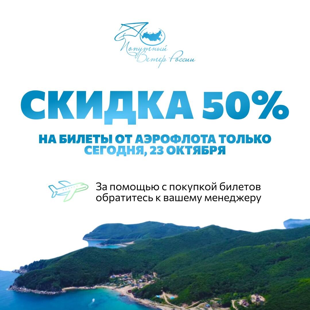 ✈️ Аэрофлот объявил акцию: билеты со скидкой 50%! Друзья, отличная новость для всех, кто уже забронировал наши туры 💙 Сегодня действует акция от Аэрофлота: скидка 50% на перелёты с 26 октября 2025 по 28 марта 2026 Это тот редкий случай, когда можно купить очень комфортные билеты по цене «Победы» и отправиться в путешествие с багажом, вкусным питанием и нормальным расстоянием между креслами 😄 Если сомневаетесь с датами или направлением, то ваш менеджер поможет подобрать оптимальные рейсы под тур. Напишите ему напрямую или нам в личные сообщения @wildtail_tour 📅 Акция действует только сегодня, поэтому не откладывайте!