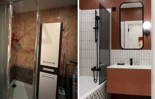 Разница до и после ремонта впечатляет! Эта двушка на вторичном рынке была обустроена дизайнером Екатериной Пашниной для молодой девушки. Основной задачей было создать яркий и нестандартный интерьер со множеством мест для хранения. Дизайнер использовала смелые решения, которые кардинально изменили пространство. Показываем, как преобразился санузел. Санузел до ремонта представлял собой темные, неуютные помещения с устаревшей отделкой. В ванной комнате была душевая, однако из-за наличия большого количества вещей пространство казалось захламленным и непривлекательным. Санузел в квартире раздельный. Для создания единого стиля использовали одинаковую отделку в обоих помещениях. На полу уложили белую плитку с графичным черным узором, а на стенах применили краску в терракотовом оттенке и белую плитку с затиркой в цвет стен. В ванной комнате разместили ванну и большой шкаф для стиральной машины и уборочного инвентаря, а также установили тумбу с широкой столешницей. Вместо шторки использована ст