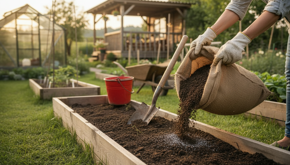 Дальше перешёл к методу, который на практике и дал разницу. Вместо кустовой посадки пятнами мы сделали ленточную траншею. На шнур отбил ровную линию, снял дерн, раскрылась влажная тёмная земля, в воздух пошёл густой запах перегноя. Копал до штыка с половиной, это около 35–40 сантиметров. В некоторых инструкциях питомников видел цифры 30 сантиметров, а у других до 45, по факту глубину выбираю под конкретную почву. На нашей суглинистой земле 35–40 см оказались тем самым компромиссом, чтобы корням было куда разворачиваться и чтобы не уходить в глину, где застаивается вода. На дно траншеи мы внесли по ходу рядка перегной из мешков, примерно 8–10 килограммов на квадрат. Под руку попалась зола из печи, просеял и сыпал умеренно, стакан на погонный метр, и немного суперфосфата по инструкции на пакете, чтобы не переборщить. Если у вас тяжёлая почва, имеет смысл добавить ведро крупного песка или немного верхового торфа на метр, рыхлость в первые годы ощутимо помогает.