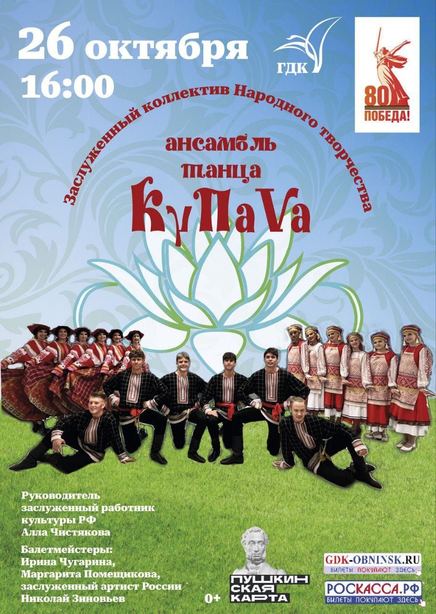 26 октября 16:00 в ГДК концерт ансамбля танца «КупаVа» Концерт многократного обладателя Гран-при, заслуженного коллектива народного творчества ансамбля танца «КупаVа». Каждый выход участников ансамбля на сцену становится праздником танца, а каждый танцевальный номер – мини-спектакль, где хореография, музыка и костюмы едины. 🎫Билеты - https://gdk-obninsk.ru/board/afisha/koncert_ansamblja_tanca_kupava/1-1-0-795 Обнинск, пр-т Ленина, 126. 👍 Подписаться | Ваша реклама