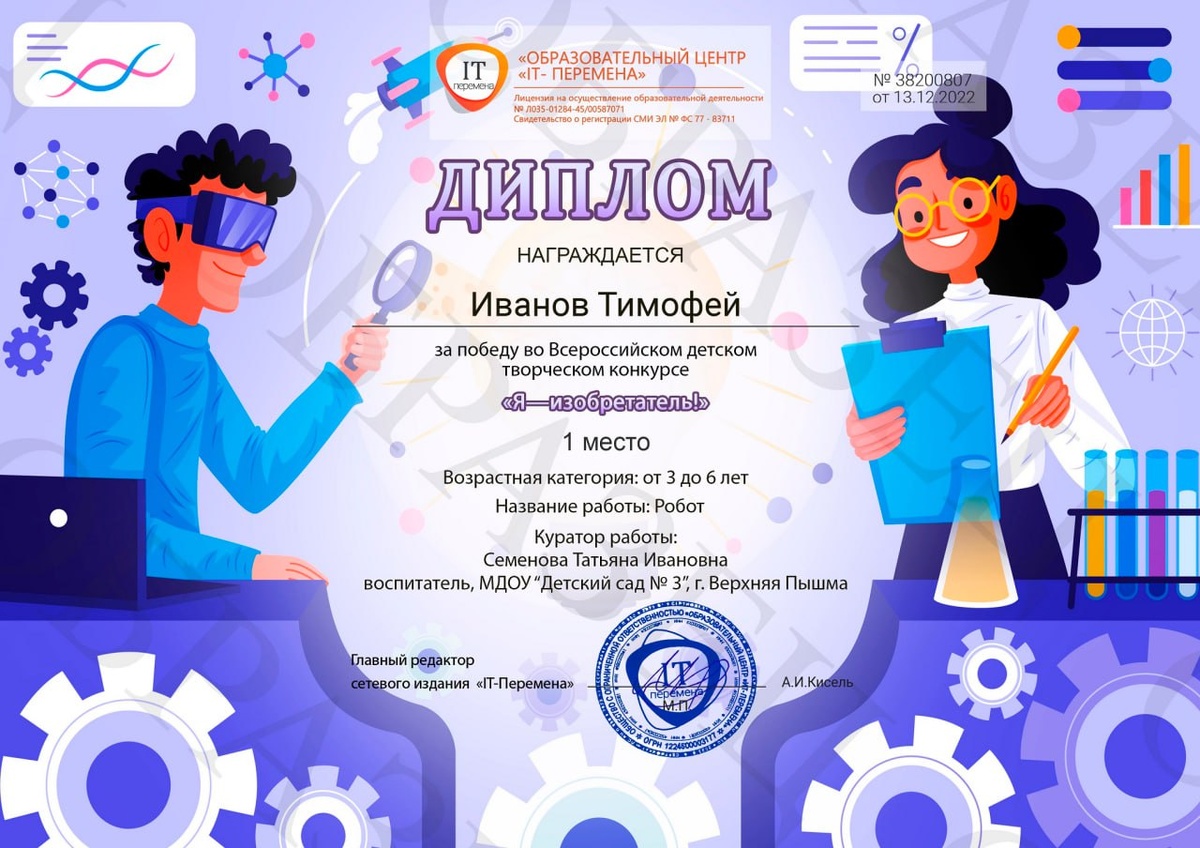 Мы подвели итоги бесплатного Всероссийского детского творческого конкурса "Я—изобретатель!"! Результаты и наградные документы уже размещены в нашем новом поисковом телеграм-боте "Переменка": https://t.me/itperemenka_bot На сайте на странице результатов итоги будут опубликованы 27 октября в 8:00 по МСК. Заказать оригиналы наградных документов, напечатанных в высоком качестве на плотной бумаге, можно под соответствующим дипломом.