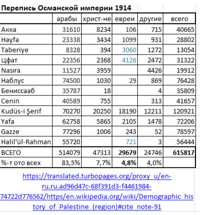 Иудеи занимали почётное третье место в Иерусалимском мутасаррифате, Наблусском и Акрском санджаках. Они грубо соответствуют землям Палестины. Лишь в трёх регионах (голубым цветом) христиане уступали по численности иудеям. С мусульманами религиозные меньшинства нигде не выдерживали сравнения. Как создать «еврейское» государство при таком раскладе? Только сегрегацией и геноцидом. 100 лет назад Палестина была мононациональной территорией с рассеянными по ней представителями национально-религиозных меньшинств. Сравните ситуацию с Европой, где многие страны - официально мононациональны, хотя процент титульной нации уступает палестинцам.