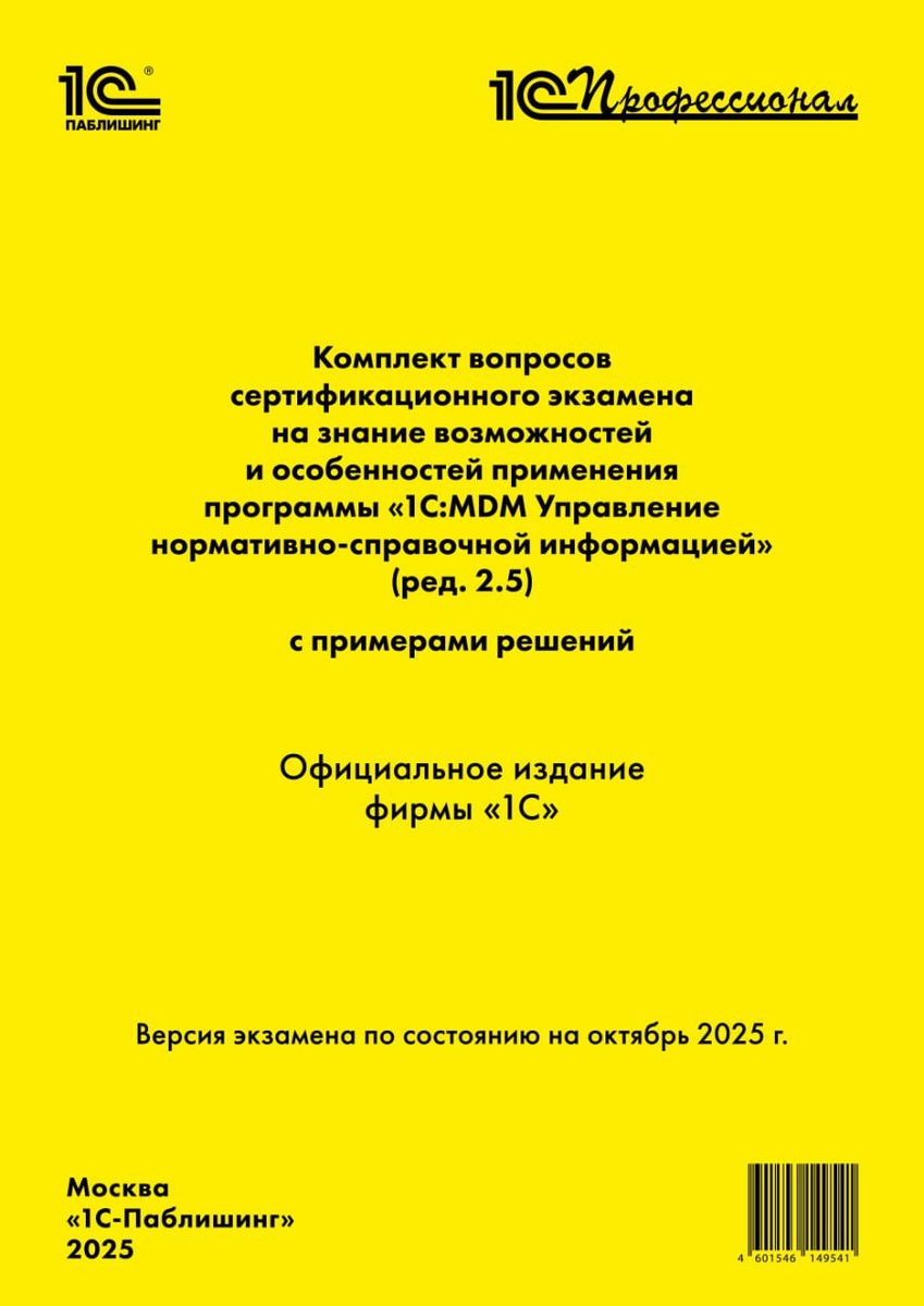 📰📰🗞 Сообщаем вам о расширении линейки экзаменов 1С:Профессионал. ⚡️ С 24 октября 2025 года начнется тестирование "1С:Профессионал" на знание возможностей и особенностей применения программы "1С:MDM Управление нормативно-справочной информацией" (ред. 2.5). ‼️ 1С:MDM Управление нормативно-справочной информацией" ("1С:MDM") – это программный продукт, разработанный фирмой "1С" для эффективного, контролируемого и гибкого управления справочниками в распределённой ИТ-инфраструктуре. 📌 Сертификат "1С:Профессионал" на знание возможностей и особенностей применения программы "1С:MDM подтверждает не только владение функционалом "1С:MDM", но и понимание лучших практик управления нормативно-справочной информацией (НСИ) в корпоративной среде. Экзаменационные задания разработаны таким образом, чтобы объективно оценить как теоретическую подготовку, так и способность применять полученные знания для решения реальных бизнес-задач применяя "1С:MDM". 📚 С сегодняшнего дня в продаже доступен Комплект