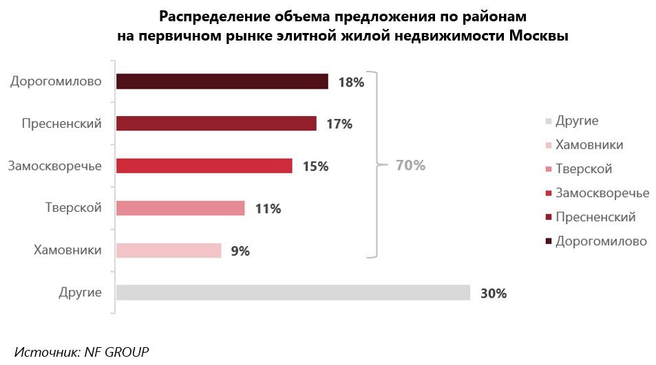 По итогам III квартала 2025 года на первичном рынке элитной жилой недвижимости Москвы экспонировалось около 3,1 тыс. высокобюджетных квартир и апартаментов. В сравнении с результатами II квартала значение снизилось на 4%, за год, напротив, выросло на 6%. В разрезе районов лидирующую позицию по объёму предложения в новостройках занял район Дорогомилово. На конец сентября 2025 года в локации экспонировалось 18% от общего объёма предложения на рынке элитного жилья. На втором месте с долей 17% – Пресненский район, а на третьем – Замоскворечье, где представлено 15% от общего числа всех доступных лотов.