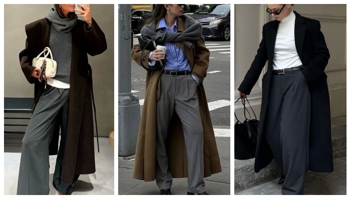 Серые брюки — настоящая классика, которая осенью приобретает особую актуальность. Это базовая вещь, способная стать основой как для строгих, так и для расслабленных образов. На примерах мы покажем, насколько по-разному можно интерпретировать серые брюки — от минимализма до кэжуала и даже делового шика. Женственный и элегантный вариант с ноткой ретро-шика. Широкие серые брюки идеально сочетаются со светлым свитером и роскошным пальто с меховыми вставками в тёплом карамельном оттенке. Объёмное верхнее пальто создаёт эффект уютного кокона, а крупная кожаная сумка и солнцезащитные очки добавляют городского шика. Монохромная элегантность в серых тонах. Свободные брюки и объёмный свитер с высоким воротом образуют мягкий силуэт, в котором комфорт и стиль идеально сочетаются. Тонкий ремень подчёркивает талию, добавляя структуру, а лаконичные балетки и горчичная сумка придают образу изысканную простоту. Это пример современного минимализма — сдержанно, чисто и дорого. Современный кэжуал с лёгким