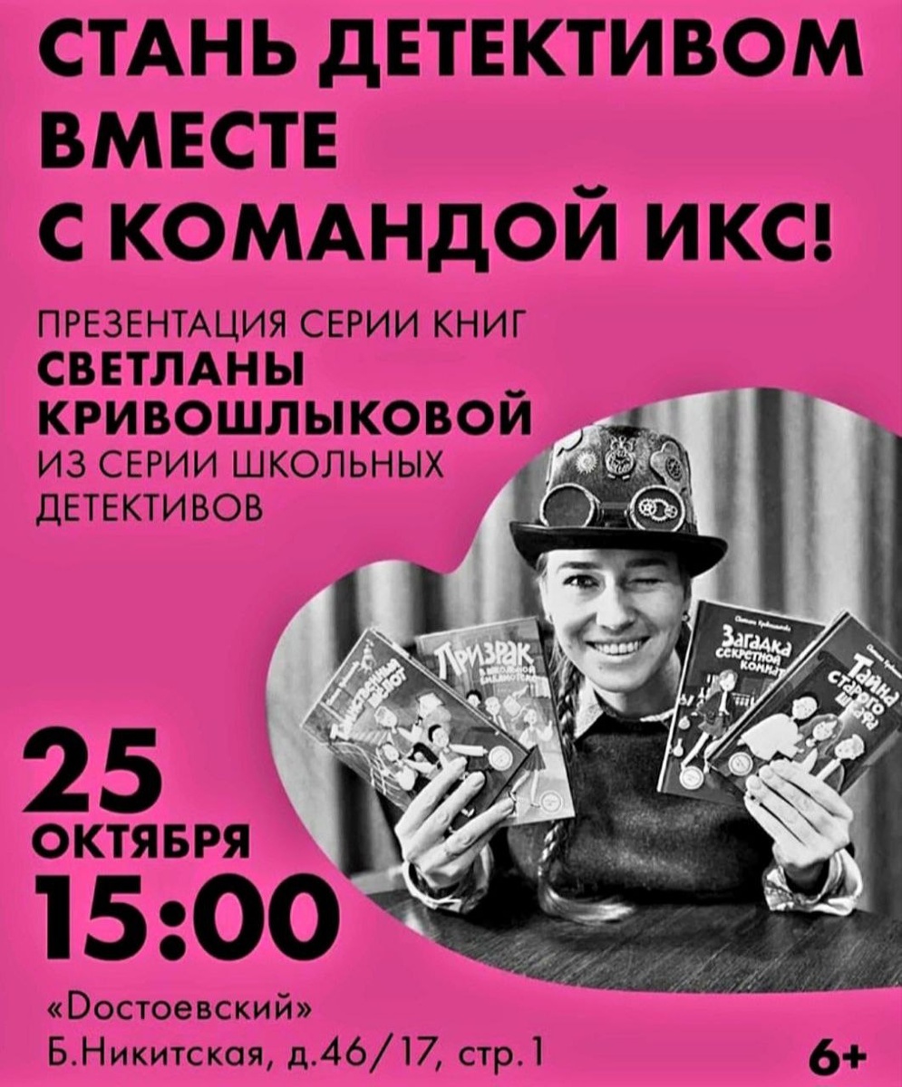 Приглашаем всех юных сыщиков и их родителей на встречу с писательницей Светланой Кривошлыковой — автором серии школьных детективов «Призрак в школьной библиотеке», «Таинственный шёпот», «Загадка секретной комнаты» и «Тайна старого шкафа»! Ты узнаешь: 🕵️♂️ кто может стать детективом — и что общего у тебя с героями книг; 💡 пройдёшь испытание на внимательность и логику; вместе с друзьями расшифруешь таинственную флешку; 📚 а в финале — узнаешь секреты создания настоящих детективов и первым услышишь истории из новых книг! Тебя ждёт интрига, смех, открытия и настоящий дух расследования! Приходи — и, возможно, именно ты разгадaешь следующую школьную тайну! Регистрация по ссылке https://muzey-voennoy-istorii-ros.timepad.ru/event/3634650/