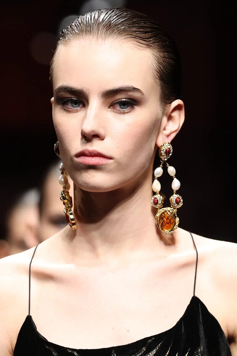 Глянцевая помада яркого цвета — то, к чему многие боятся подступиться, потому что сложно нанести, а еще сложнее не размазать. Но визажисты Dsquared2, Versace, Tom Ford и MSGM в сезоне осень—зима 2025/2026 призывают нас быть бесстрашными и вспомнить несколько простых правил. «Во-первых, подготовить губы с помощью скраба или мягкой зубной щетки, поверхность должна быть гладкой. Во-вторых, нанести тональный крем или консилер по контуру, а потом закрепить все пудрой, чтобы повысить стойкость помады», — советует визажист и основатель бренда Nikk Mole Мила Клименко. В-третьих, обвести губы карандашом желаемого цвета, а уже потом добавлять поверх блеск — так сделали Пэт Макграт на Versace и Клаудиа Малаваси на MGSM. А в-четвертых, перестать, наконец, переживать, если что-то смажется или отпечатается на зубах.