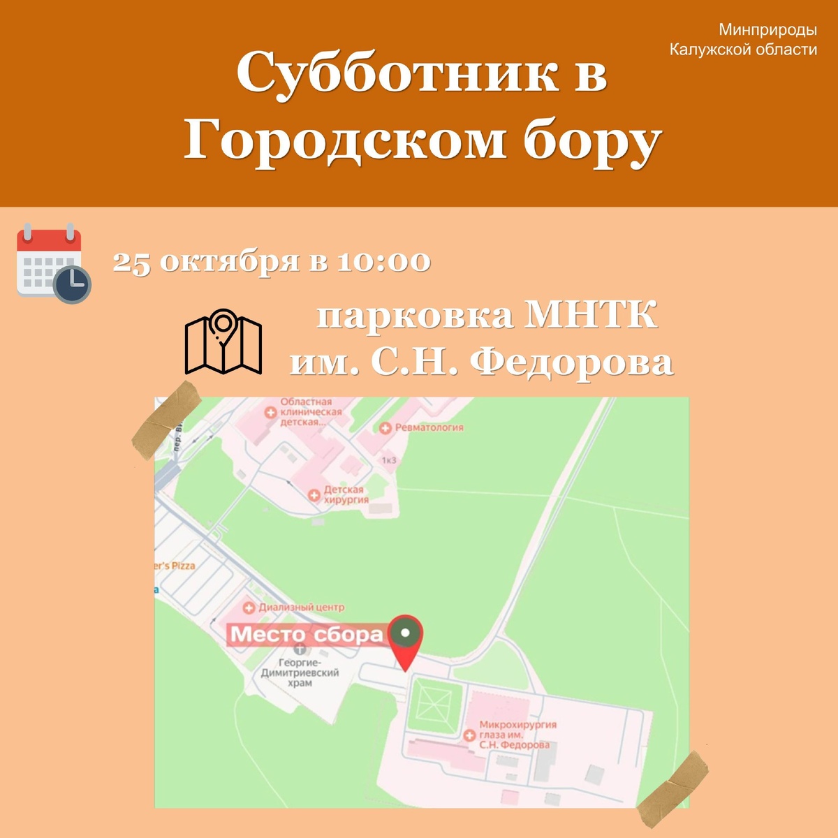 Совсем скоро закончится месячник субботников! 🌲 📌 25 октября в 10:00 приглашаем вас принять участие в заключительном субботнике, который пройдет на территории Городского бора! 📍Место сбора: парковка МНТК им. С.Н. Федорова. Присоединяйтесь! В случае неблагоприятных погодных условий дата и время проведения уборки территории могут измениться!