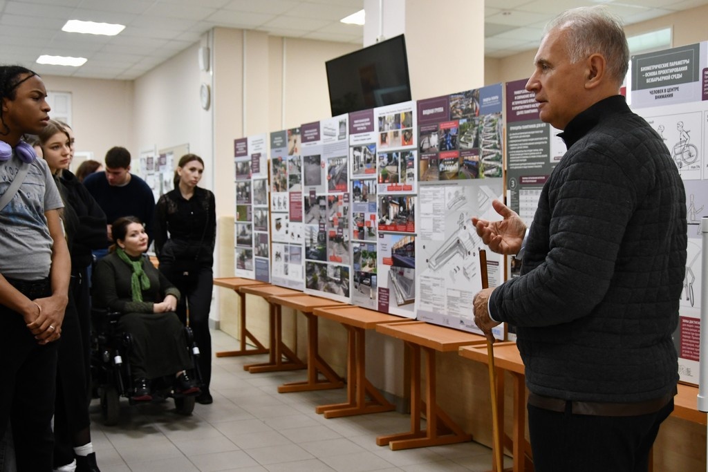 Сегодня в Вологодском государственном университете открылась выставка «Город в деталях. Универсальный дизайн и проектирование безбарьерной городской среды». Студенты второго курса ИСИ ВоГУ с преподавателями пришли узнать, как сделать город удобным для каждого — особенно для людей с ограниченными возможностями. Экспозиция показывает, какими должны быть улицы, площади, здания, чтобы ими могли пользоваться все: взрослые и дети, маломобильные и пожилые. Организаторы уверены — будущие архитекторы должны думать о доступности с самого начала учебы, ведь скоро им самим предстоит работать над реальными проектами. Выставку открыли руководители и эксперты: Александр Кремин, первый проректор ВоГУ, Анна Хрястунова, советник губернатора по инклюзии, член Общественной палаты, и Сергей Чистый, председатель благотворительного фонда «Город для всех». Сергей Чистый работает ведущим научным сотрудником МГУ, читает курсы о доступной архитектуре в МАРХИ и активно делится опытом с практикующими специалистами