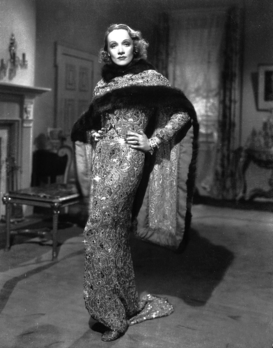 В 1937 году Марлен Дитрих вновь доказала, что её стиль — это не просто одежда, а тщательно выстроенная драматургия образа. В фильме Эрнста Любича «Ангел» актриса предстает в вечернем ансамбле, который считается одной из вершин голливудской костюмной эстетики довоенной эпохи. Наряд, созданный главным художником по костюмам студии Paramount Трэвисом Бэнтоном, не просто поражал красотой — он превращал Дитрих в живую скульптуру света и блеска. Костюм включал приталенный верх с рукавами три четверти, длинную юбку со шлейфом и широкую накидку-боа, отделанную соболем. Лаконичный крой стал идеальным фоном для богатейшей вышивки: тысячи крошечных бусин, стекляруса, жемчуга, золотой канители, пайеток и страз создавали орнамент, вдохновлённый барочной декоративностью и восточными мотивами. Даже в чёрно-белом кино он оставался выразительным, играя на контрасте света и фактуры. Особое внимание привлекала роскошная меховая накидка: она не только усиливала сияние платья, но и служила приёмом режи