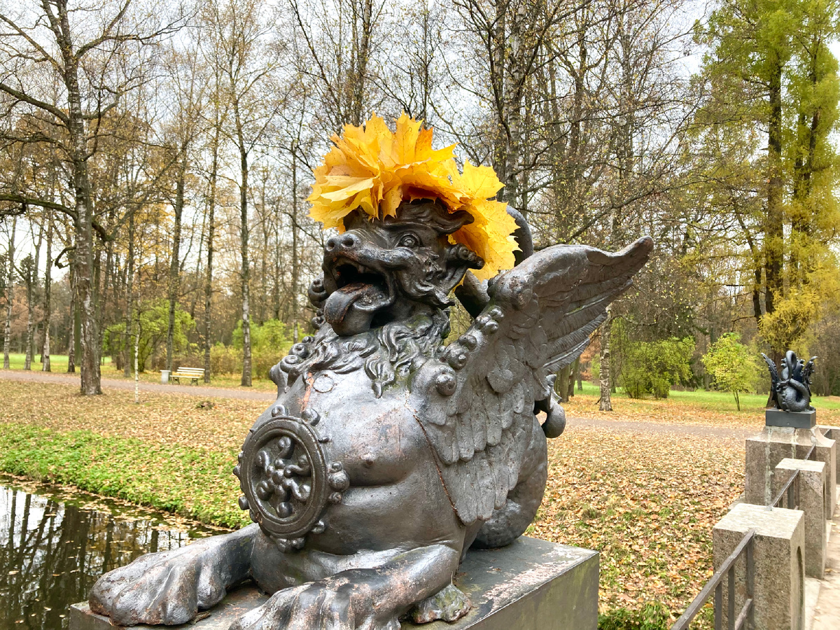 Когда шла по аллее обратно, кто-то украсил дракона жёлтыми кленовыми листьями, очень мило).