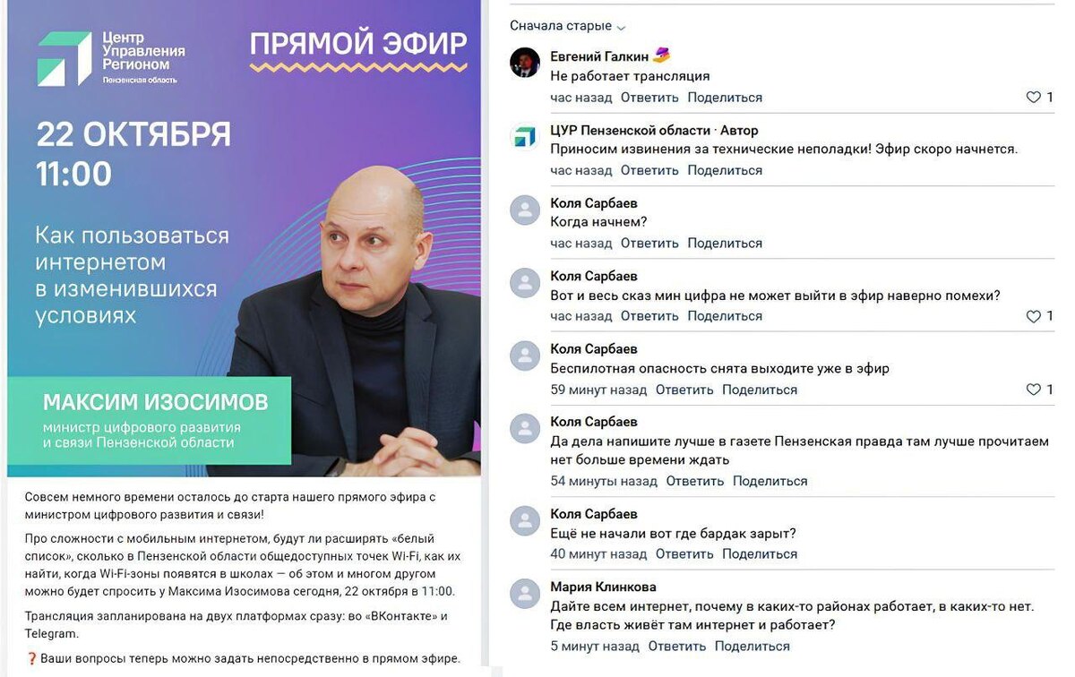 В рубрике «Перлы недели» глава пензенского Минцифры не смог провести эфир о проблемах с интернетом из-за