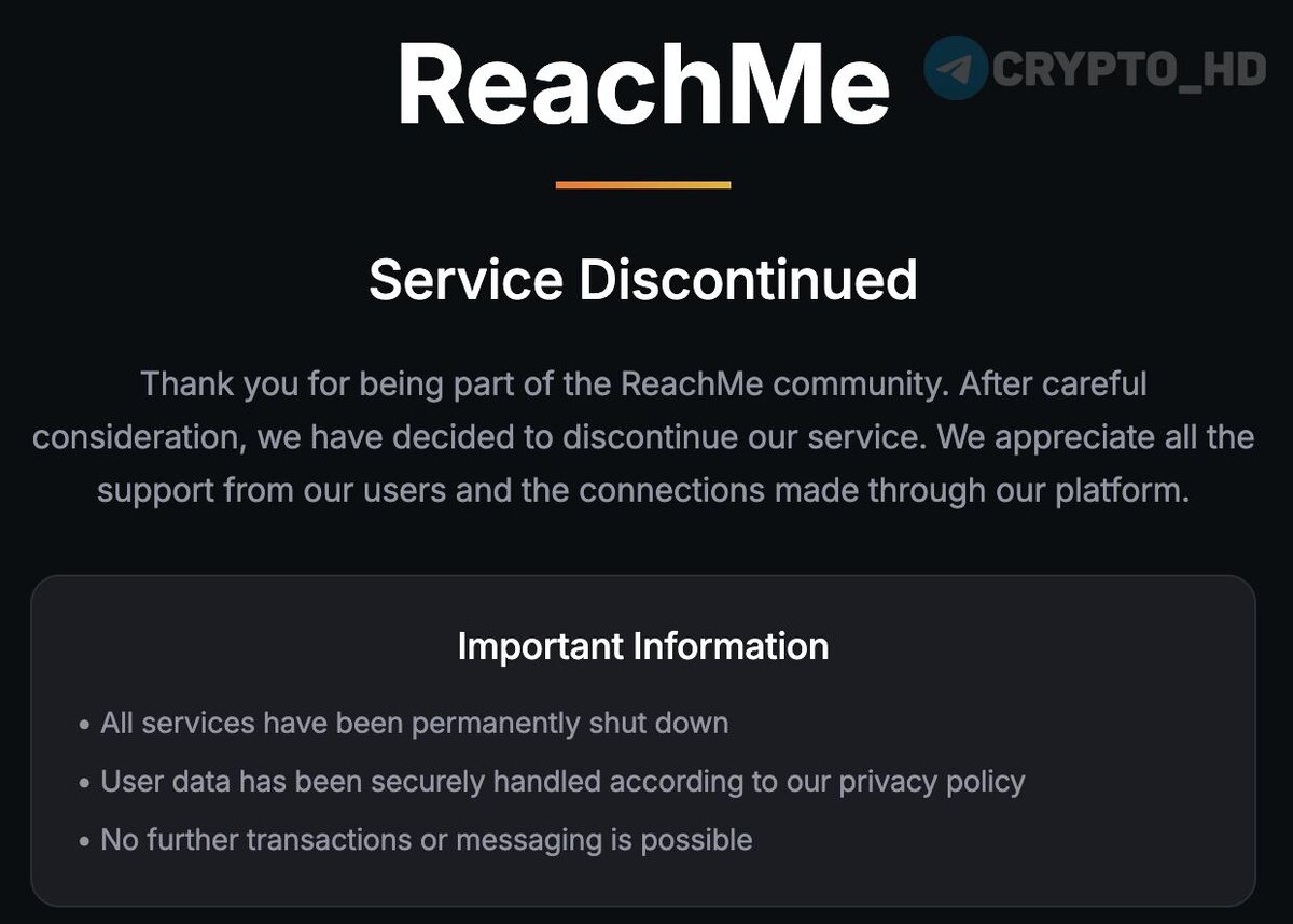 😐 Платформа платных сообщений ReachMe на BNB Chain, через которую CZ когда-то принимал личные сообщения за 1 BNB, объявила о прекращении работы.