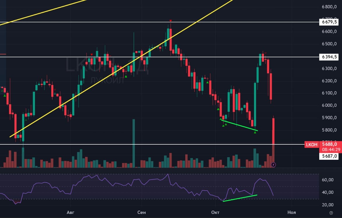 ⛽️ Лукойл! 🟢 Сегодня прилетели санкции на Лукойл и дочки со стороны США. В целом санкции РФ обходить мы умеем, натренировались на санкциях ЕС. Но это может занять какое-то время. СД по дивам перенесли не известно на какой срок, но скорее всего на неделю. 🟢 Технически картинка грустная. Пришли к уровню июля 2025 года, где падение Лукойла было без новостей, тогда грешили на выход нерезов. Сейчас упали хотя бы известно на чём. На дневках была конвергенция + сигналы на покупку, но негативные новости сломали структуру. и сейчас тут ничего нет кроме поддержки. 🚗 Ждем вечером Трампа, от этого зависит, устоит поддержка или нет. #Лукойл #LKOH #bogdanoffinvest