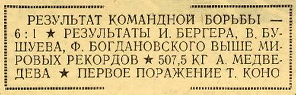 Здесь, в Выставочном зале «Интернейшнел амфитеатр», состоялась первая из трех намеченных встреч между американскими и советскими тяжелоатлетами. Три года назад в Москве наши штангисты в матче СССР-США одержали победу со счетом 4:3. Более двух тысяч зрителей, заполнивших Выставочный зал, ожидали на этот раз увидеть реванш американских спортсменов. Но уже в легчайшем весе В. Стогов на 17,5 кг опередил Ч. Винчи. Он поднял в сумме троеборья 342,5 кг. Исключительно упорной была борьба между старыми соперниками Е. Минаевым и И. Бергером. Бергер, подняв 365 кг, сумел опередить Минаева на 5 кг. После того, как В. Бушуев одержал легкую победу над Д. Питмэном с новым всесоюзным рекордом в троеборье 390 кг, счет встречи стал 2:1 в пользу советских штангистов. Зрители возлагали большие надежды на непобедимого Томми Коно. Шестикратный чемпион мира и олимпийских игр за 6 лет не имел ни одного поражения. Два месяца назад, выступая в Москве, он взял верх над олимпийским чемпионом Ф. Богданов