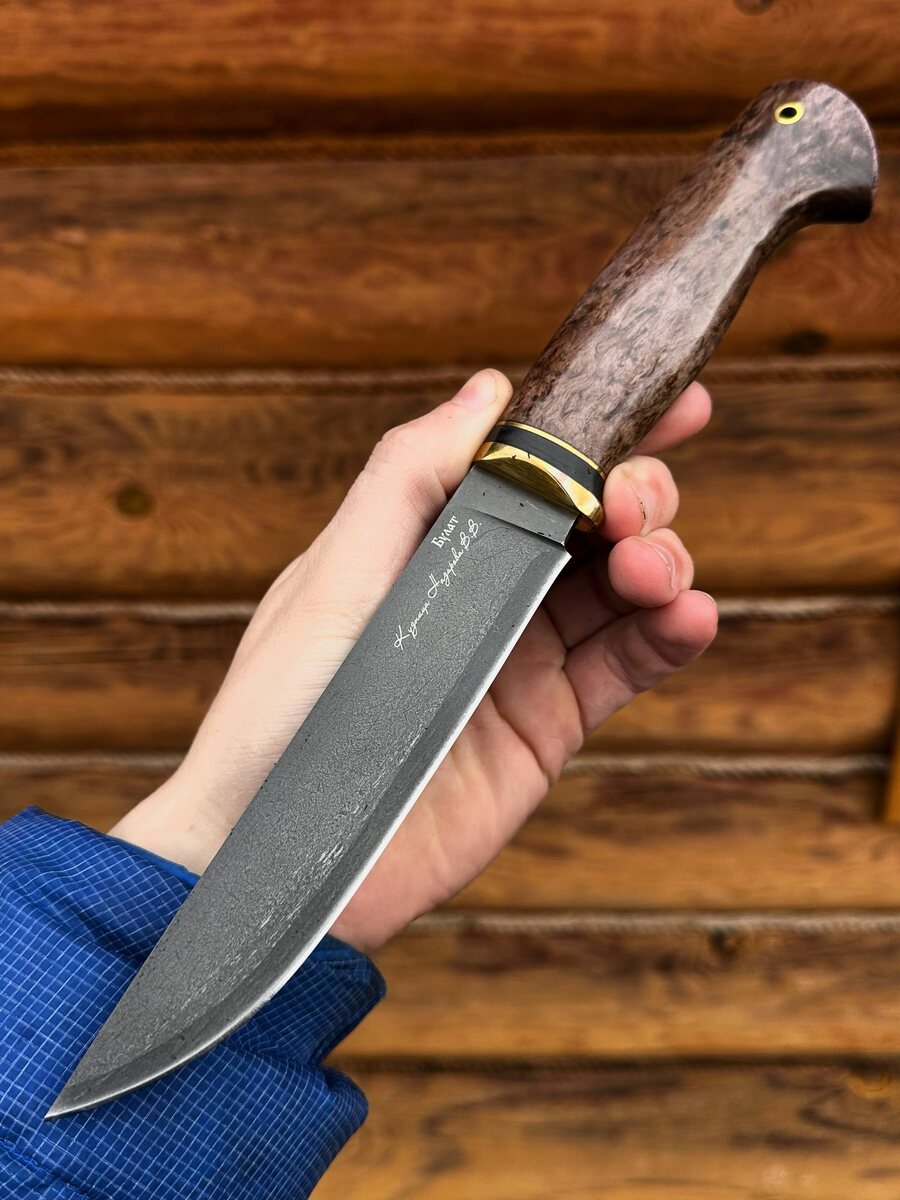 🔥 Готов к продаже: нож «Засапожный» из тигельного булата! Преимущества: - *Тигельный булат* — сталь, которая долго держит заточку и обеспечивает агрессивный рез. - Полные спуски от обуха — для идеального реза без сопротивления. - Рукоять из оранжевого капа клена — удобно лежит в руке и выглядит эффектно. - Безопасная гарда для комфортной работы. - Твердость клинка: 64-65 HRC — *режет как бритва*. - В комплекте — ножны из натуральной кожи. Можем сделать формованные ножны (+8 000 ₽). Отлично подойдет: - Охотникам, рыбакам, туристам, коллекционерам и просто ценителям настоящих вещей. Цена: ~17 330 ₽~ 9 500 ₽ по акции! Арт: 2079-1 📩 Заказать можно прямо сейчас: • Telegram: [@Nazarklinokbot](https://t.me/Nazarklinokbot) • WhatsApp/Viber: +79101343831 #кузницаНазарова #ножизбулата #ручнаяработа #засапожный #купитьнож #подарокмужчине #охотничийнож #коллекционныйнож