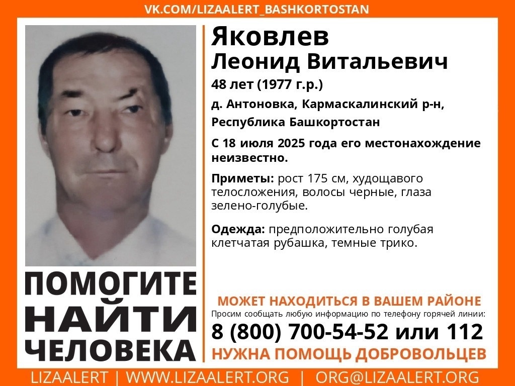 Поиски жителя деревни Антоновки в Кармаскалинском районе Леонида Яковлева ведутся с середины июля. По данным отряда «Лиза Алерт РБ», мужчина мог быть одет в голубую клетчатую рубашку и темное трико.