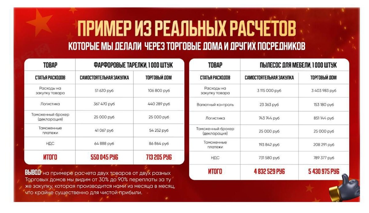Какие «настоящие» расходы в ВЭДе? Ребята, многие, кто понимают, что переход на белые закупки сейчас необходимость, а не выбор, обычно идут искать тех, кто умеет это делать. «А посчитайте мне» не работает – расчеты белых закупок занимают около недели. Конечно, все такие продавцы попадают на посредников, которые обычно очень быстро называют цены (а сами продавцы обычно от них в шоке и навсегда ставят крест на обелении). А все почему? Потому что цены называют «пальцем в небо» сразу с огромной наценкой. А еще многие думают, что если возить в белую – эти лучше делать через торговый дом. Как будто это какая-то официальная инстанция. На самом деле, торговый дом – это обычная компания-посредник, цель которой изначально была совершать платежи в условиях санкций. И вот, чтобы наглядно вам все продемонстрировать, мы потратили 2 недели, и посчитали: ▪️Сколько обходятся белые закупки самостоятельно (ну или через своего сотрудника) ▪️Сколько обходится такая же закупка через посредников Смотрите скри