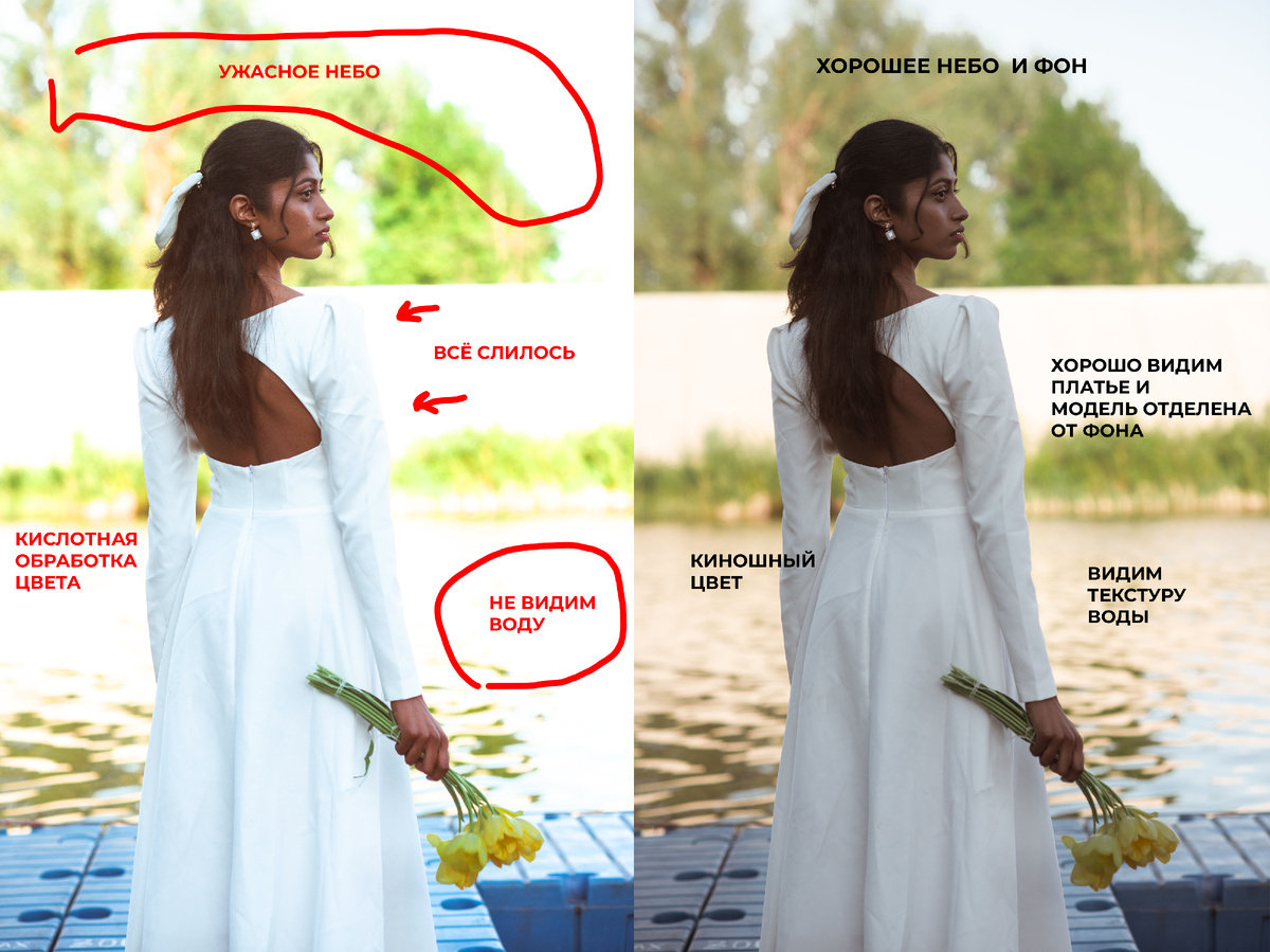 Если не учесть этого - мы можем потерять и важные детали не только на фоне. Например, мы видим, что белое платье фактически сливается с водой в реке и сама модель читается уже хуже.
