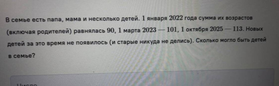 В семье есть папа, мама и несколько детей. 1 января 2022 года сумма их возрастов (включая родителей) равнялась 90, 1 марта 2023 -101, 1 октября 2025 -113. Новых детей за это время не появилось (и старые никуда не делись). Сколько могло быть детей в семье? Здравствуйте, уважаемые читатели! Поступила заявка от родителя шестиклассника на решение этой задачи 👇 . Решение. Представим данные задачи в таблице 👇 Числа 90, 101, 113 показывают разницу в сумме возрастов за разные промежутки времени: 101-90= на 11 увеличился возраст всех за 1 год и два месяца. 113-101=на 12 увеличился возраст всех за 2 года и 7 месяцев. По этим данным трудно определить количество детей в семье. Дополним таблицу 👇 Воспользуемся методом перебора. 1) Предположим, что в семье один ребенок и семья, включая родителей, состоит из трёх человек. На 1 января 2024 года сумма возрастов 96. Это показано в таблице. Но по условию задачи 1 марта 2023 года она уже достигла 101. Значит, наше предположение, что в семье один р