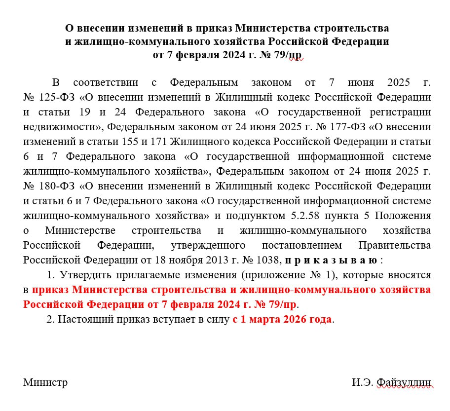🔘В электронном паспорте появятся новые разделы: ▪️о техническом состоянии дома, ▪️проведённых работах, ▪️признании здания аварийным. Нововведение позволит собственникам и нанимателям видеть актуальную информацию, контролировать деятельность УК и участвовать в решениях по ремонту и модернизации. 🔘Единая база откроет доступ к проверенным данным для органов власти, застройщиков и РСО. 🔘Также предлагается установить чёткие сроки их внесения и обновления. Большинство новых данных об МКД нужно будет загрузить в систему не позднее чем через 15 дней после ввода здания в эксплуатацию или изменения данных о нём. ❗️За нарушение порядка размещения данных, неполную или недостоверную информацию в ГИС ЖКХ предусмотрены штрафы до 50 тыс. рублей по ст. 13.19.1 КоАП РФ. Изменения заработают с 1 марта 2026 года.