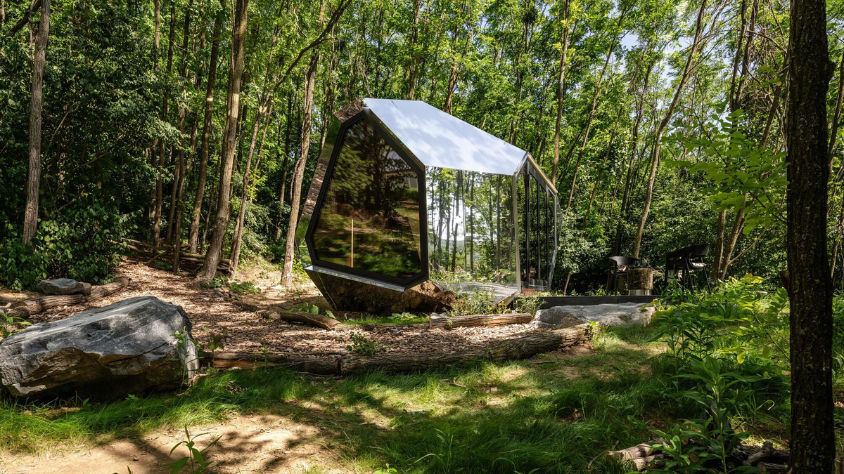 Жить в камне — отличная идея, если речь идёт о модульном доме PEBL Grand от студии Hello Wood. Правда, «камушек» для кемпинга сделан вовсе не из камня, а из дерева, скрытого под зеркальной поверхностью. Мобильная конструкция, которую можно собрать всего за один день, включает спальню, кухню, ванную и даже сауну с панорамным видом на любой пейзаж, куда бы ни доставили это уютное мини-жилище. Необычная угловатая форма — не только дизайнерское, но и функциональное решение: модуль даёт максимум естественного освещения внутри и легко справляется с непогодой снаружи. Зеркальная облицовка — базовый вариант компактного домика, но доступны и другие отделки: от деревянных панелей до материалов, имитирующих натуральный камень. Фото: György Palkó, Márton Bognár / designboom Куда бы установили такой дом-камушек?