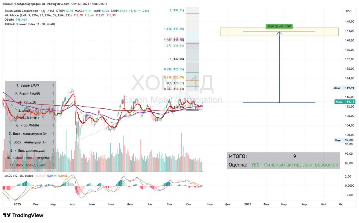 Акции нефтянки мировой смотрят наверх. #XOM Мировой гигант Exxon Mobil собрался в рост ↗️ Индекс силы Аромат 💪 Aromath Power Index = 9. Нефть вниз - акции вверх. Нефть уже тоже сейчас становится вверх. ❓Почему так всегда происходит - подробно объяснил на БМВ Аромат от 16.10.2025. Смотреть на Ютуб или смотреть в ВК.