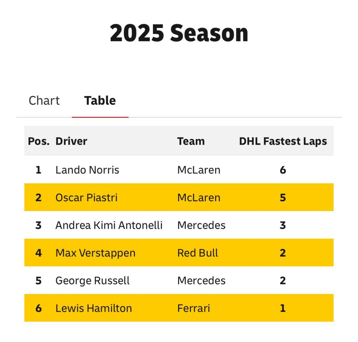 Таблица быстрых кругов в сезоне 2025 года Как видим то, что Ред Булл в прошлом году своими действиями в Сингапуре привели к отмене очка за быстрый круг, играет в этом году на руку Максу. Отрыв Ландо сейчас был бы на 4 очка больше, а Пиастри на 3.