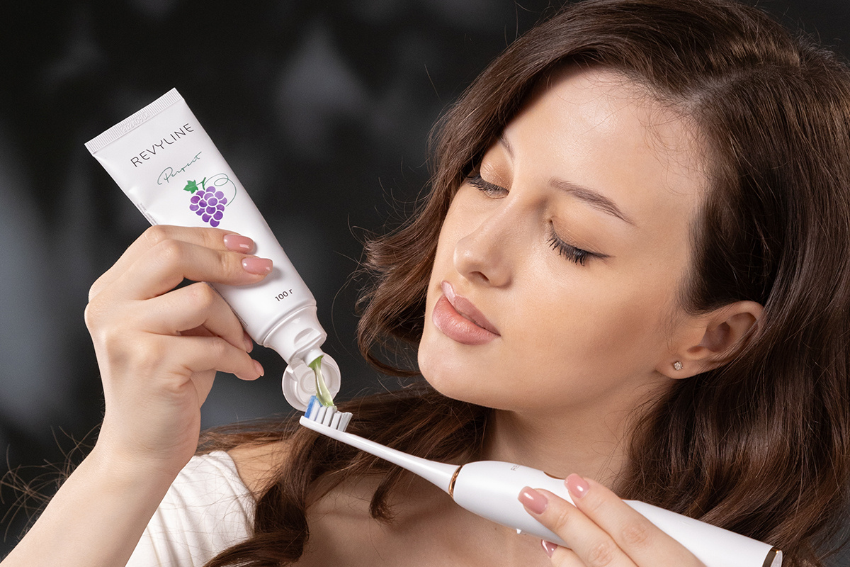 Отбеливающая паста работает эффективнее всего в сочетании с зубной щёткой и ирригатором Revyline. Щётка механически удаляе