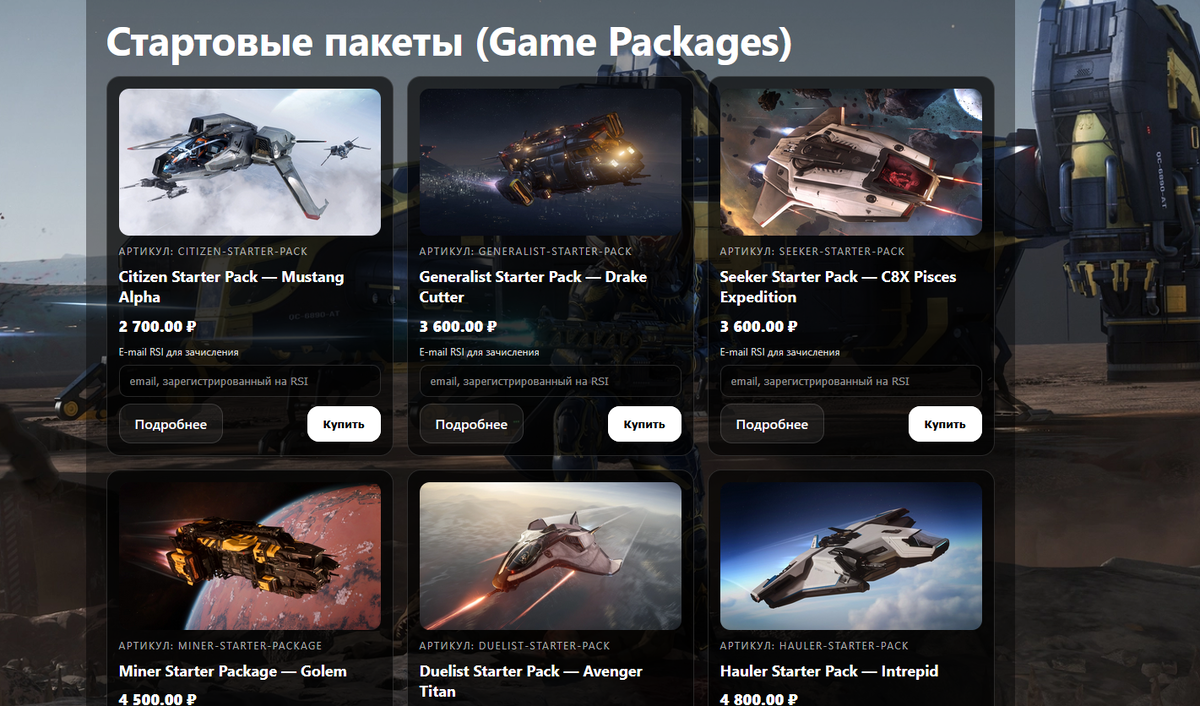 https://pledgeshop.ru — магазин Star Citizen в России. Здесь можно купить Starter Pack (стартовый набор), который включает: 💡 Цена стартового пака зависит от модели корабля и дополнительных опций: от 2 000 до 50 000 ₽.