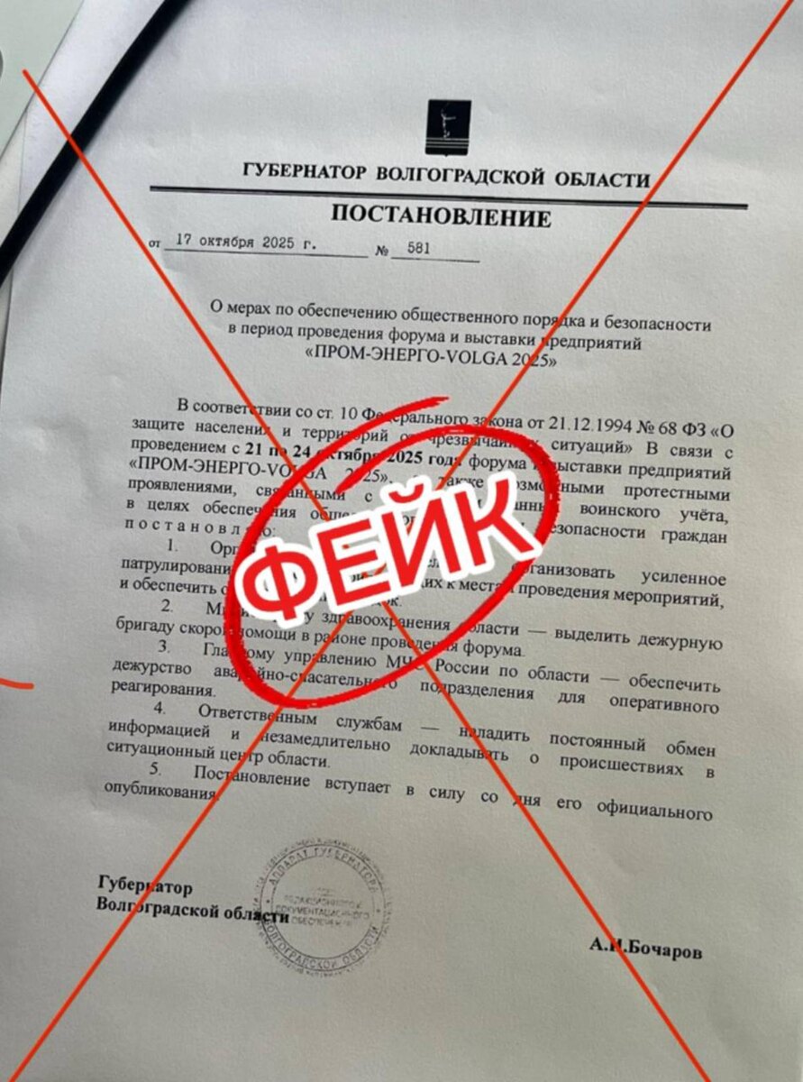 Фейк распространяют о проверке данных воинского учета у гостей на волгоградском форуме ПРОМ-ЭНЕРГО-VOLGA’2025. Власти официально назвали эту информацию ложной. Чтобы ввести людей в заблуждение, в соцсетях распространяется соответствующее постановление губернатора Волгоградской области, а также запись разговора главы города Владимира Марченко и регионального военкома Евгения Машукова. — Информация — фейк, как и фотография самого «постановления», которую распространяют боты по региональным пабликам. А запись разговора, которая также появилась в сети, сделана с помощью искусственного интеллекта и не имеет отношения ни к главе города, ни к военному комиссару. Опровержение уже выпустила и администрация Волгограда. Недоброжелатели таким образом стараются дестабилизировать обстановку и лишний раз спровоцировать негатив, — сообщает телеграм-канал «Война с фейками. Волгоградская область». Волгоградцем просят быть внимательными и доверять только проверенной информации. Новости Волгограда читайте