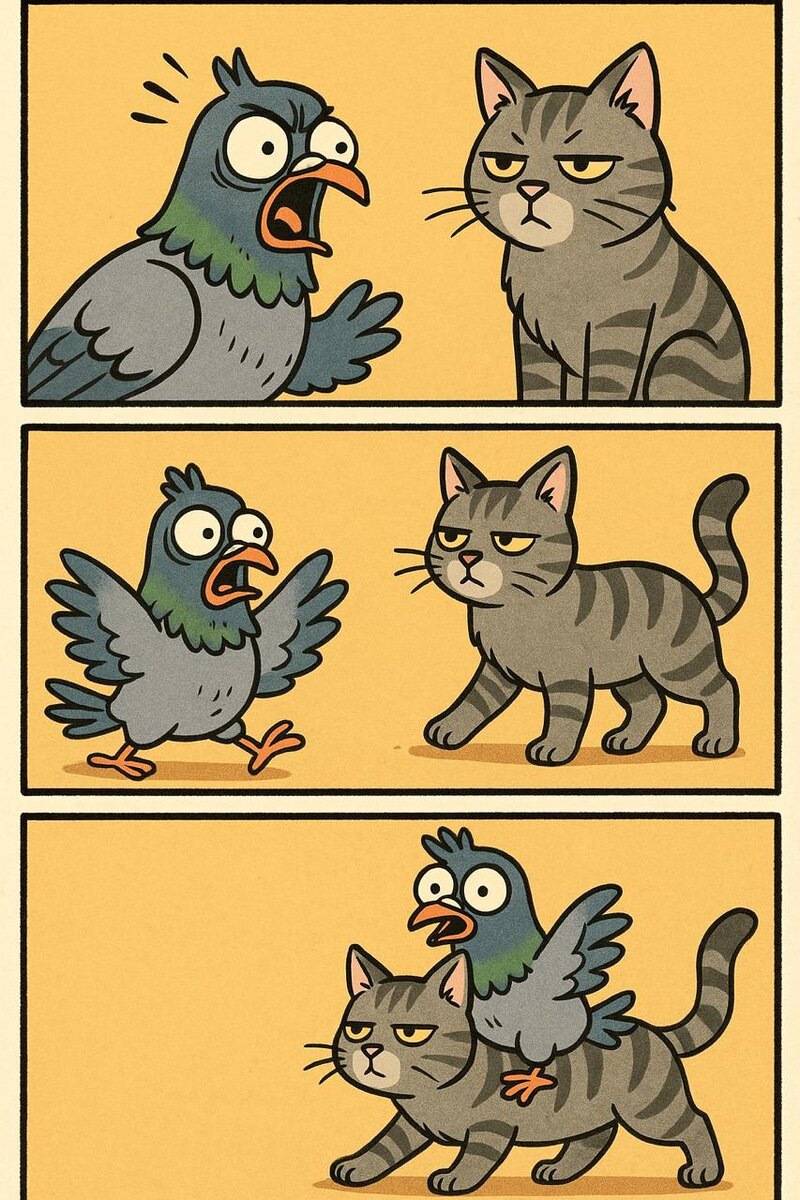 #БАЗА продолжается, но от этого не легче #Суперпозиция — это свойство квантовой системы находиться сразу в нескольких состояниях одновременно, пока не произойдёт измерение. Например, электрон может быть и «тут», и «там» одновременно. Вдох. Не пытайтесь это понять, просто пропустите это через себя и примите. В одно и то же время. В двух местах. Это нормально. Выдох. Если проще Обычно вещи ведут себя однозначно - голубь делает что-то конкретное: 😡Кричит на кота 😵Пугается кота 💂Скачет на нем верхом А в квантовом мире — он может делать все это одновременно. Но как только ты смотришь — суперпозиция исчезает, и он оказывается только в одном из этих состояний: либо орет, либо пугается, либо скачет голопом. P.S. Это как знаменитый «Кот Шрёдингера» — только у нас «Голубь Шрёдингера»: он одновременно и «есть хлеб», и «не есть хлеб», пока ты не проверил. Закрепляем информацию #Коллапс_волновой_функции — это момент, когда квантовая система из множества возможных состояний «выбирает» одно конкр