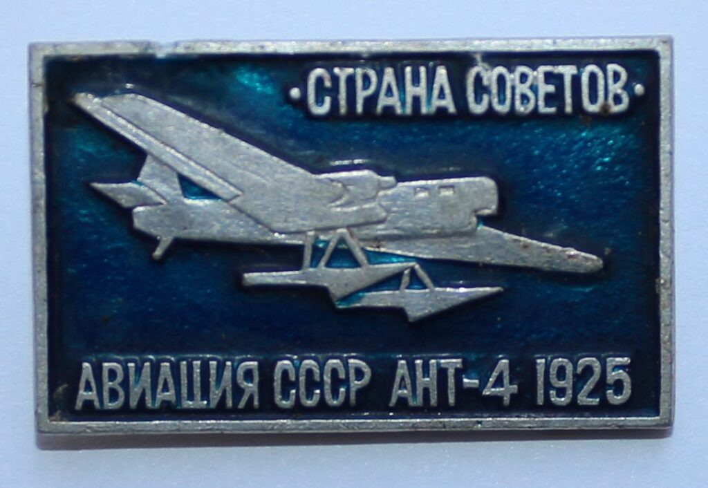 На аверсе по центру прямоугольного значка голубого цвета изображён самолёт, над ним справа надпись «СТРАНА СОВЕТОВ», по нижнему краю значка надпись «АВИАЦИЯ СССР АНТ-4 1925». Оборотная сторона значка гладкая, по центру крепление, над ним клеймо производителя, под ним цена значка «15 коп». Крепление: застежка булавочного типа.