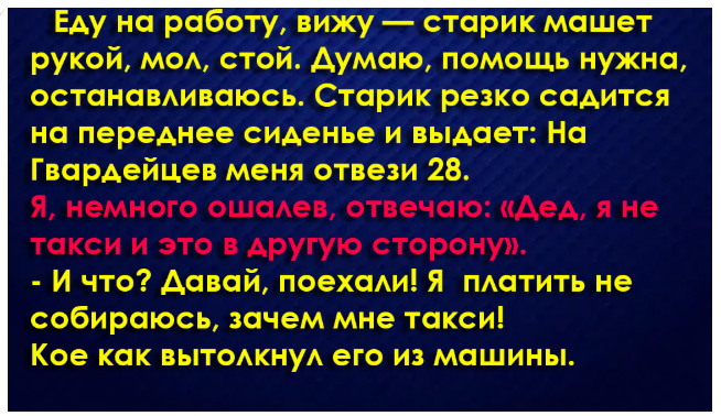 Так вот, есть одна бабулька, которая каждый день всех распахивает чтобы влезть в маршрутку первой, типа она первая пришла и дольше всех ждет. Всех распихает, со всеми перепутается, но всегда влезет первой. Едет одну (!) остановку. Одну, Карл! Там пешком идти 5 минут. И зачем???