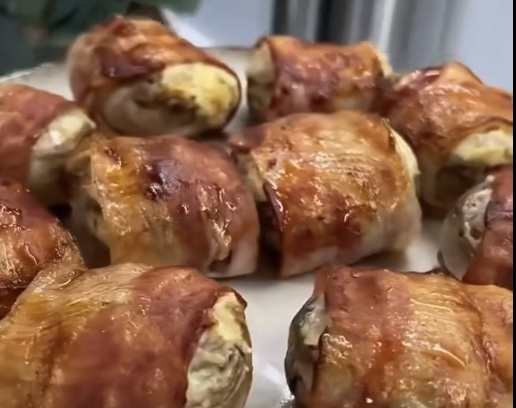 🔸 Шампиньоны - 10 шт. 🔸 Сливочный сыр - 100 гр. 🔸Твердый сыр - 50 гр. 🔸 Лук - 1 шт. 🔸 Бекон - 100 гр. 🔸 Соус барбекю ✅ Грибы моем под проточной водой и чистим. ✅ Ножки от шампиньонов мелко измельчаем и жарим на сковороде вместе с луком 5-10 минут. ✅ Охлаждаем и добавляем сливочный сыр и твердый сыр. ✅ Перемешиваем и начиняем грибочки. ✅ Заматываем грибы в бекон, смазываем соусом барбекю и выпекаем в духовке 20 минут при 200 градусах. Готово!!!😋 Для удобства рецепты есть в Телеграмм-канале.