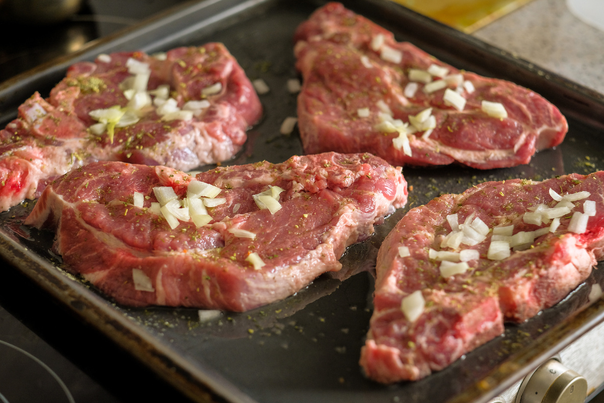 - Достаньте отбивные из маринада, стряхните лук (его можно не выкидывать, а обжарить и подать как гарнир). Обсушите мясо бумажным полотенцем.