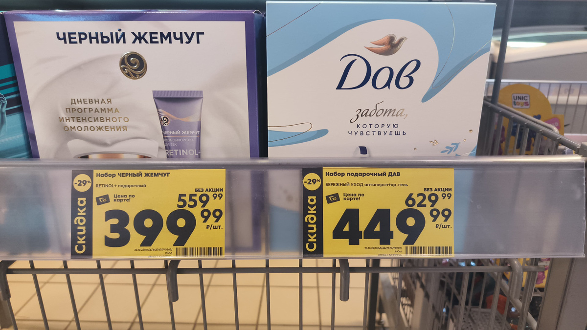 В Пятерочке скидки 50 % на продукты. Подарочные наборы со скидкой по карте.