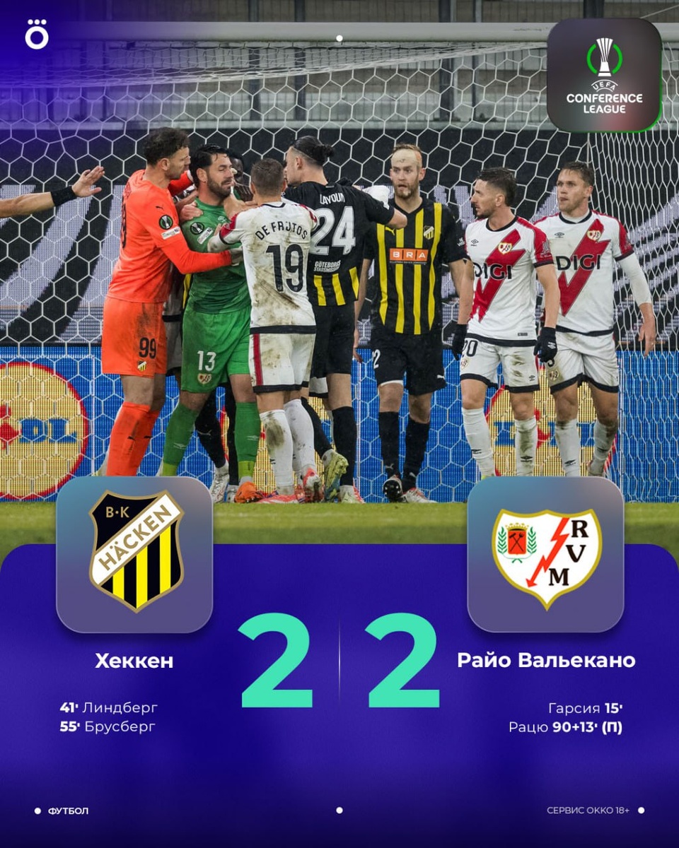 А как там дела в Лиге конференций? 🏆 Футболисты «Райо» устроили шоу в матче против «Хеккена» в Гётеборге, подрались в концовке и сравняли со спорного пенальти на 90+13-й минуте. Весело у них там в Швеции 👀