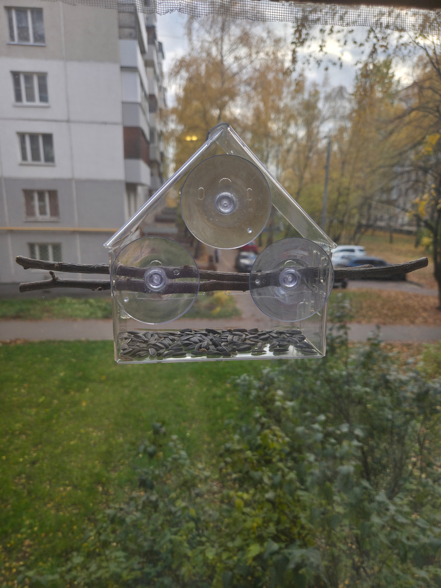 Окно я совсем ненадолго открывала, вымыла. Кормушку повесила, муж помог. Забавно, я впервые выверяла правильность установки с помощью линейки и угольника. Ровненько!
