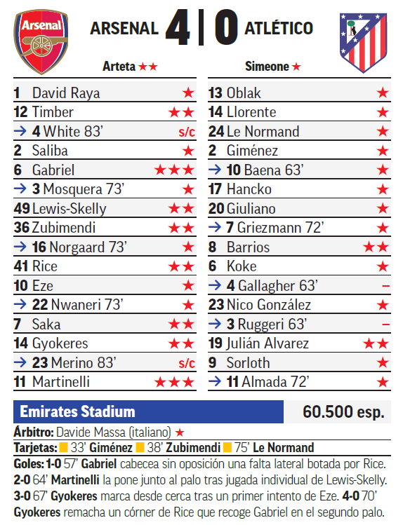 Встреча между мадридским «Атлетико» и лондонским «Арсеналом» завершилась для испанской команды тяжелым поражением. Несмотря на уверенное начало и достойное сопротивление в течение почти часа, коллектив из Мадрида не сумел удержать равновесие и пропустил четыре мяча за короткий промежуток времени. В первом тайме «Атлетико» старался контролировать ситуацию, однако оборона не справлялась с быстрыми атаками соперника. Особенно заметны были проблемы при возвращении на свои позиции и попытках организовать офсайд. Именно после одной из таких ошибок «Арсенал» открыл счет, когда Габриэл воспользовался неразберихой в штрафной площади. После пропущенного мяча мадридцы попытались отыграться, и у Джулиано был шанс сравнять счет, но мяч прошел мимо ворот. Главный тренер Диего Симеоне провел тройную замену, выпустив на поле новых игроков, однако это не принесло желаемого результата. Уже через несколько минут лондонцы забили еще трижды, продемонстрировав высокую реализацию моментов и уверенность в сво