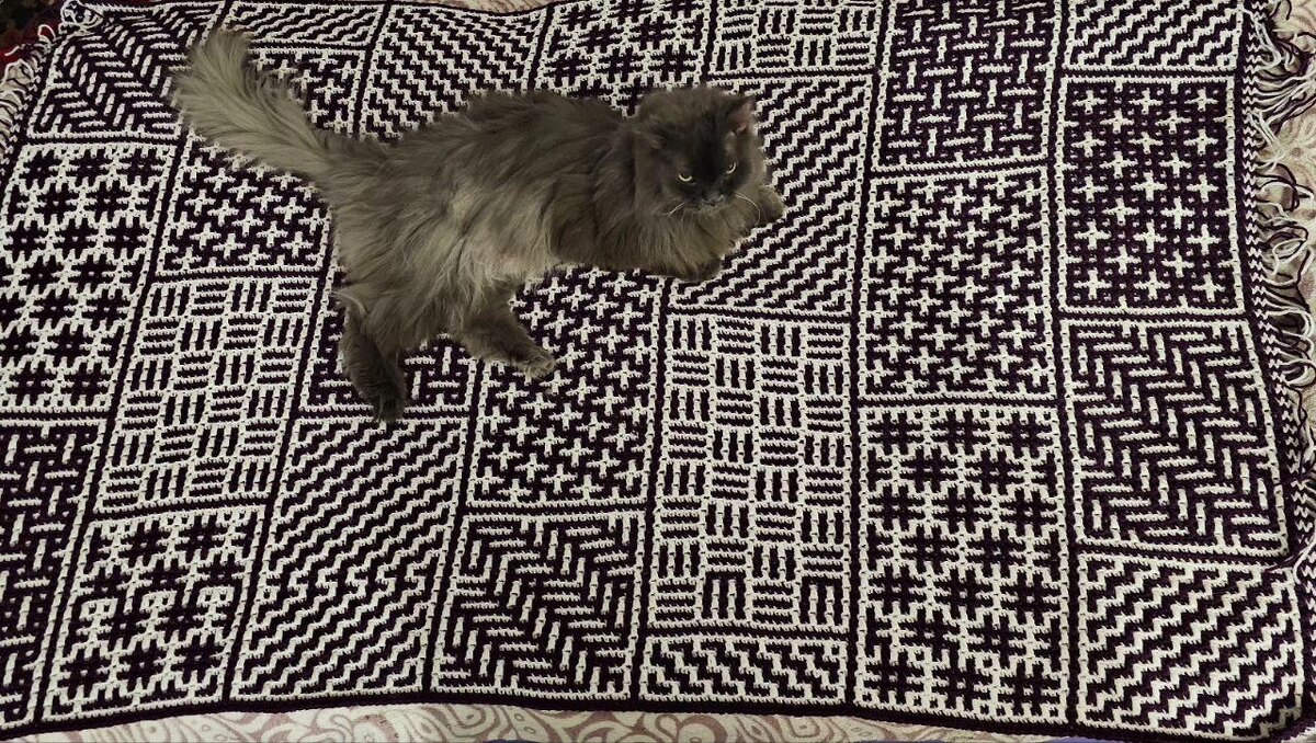 Альбина: «Всем доброго времени суток! Довязала свой узкий печворг 150 см*86 см! Пряжа:Yarnart merino de luxe 50, цвет 501 и 10094. Крючок 5. Большая благодарность вам всем. Юлии особая благодарность!!!».