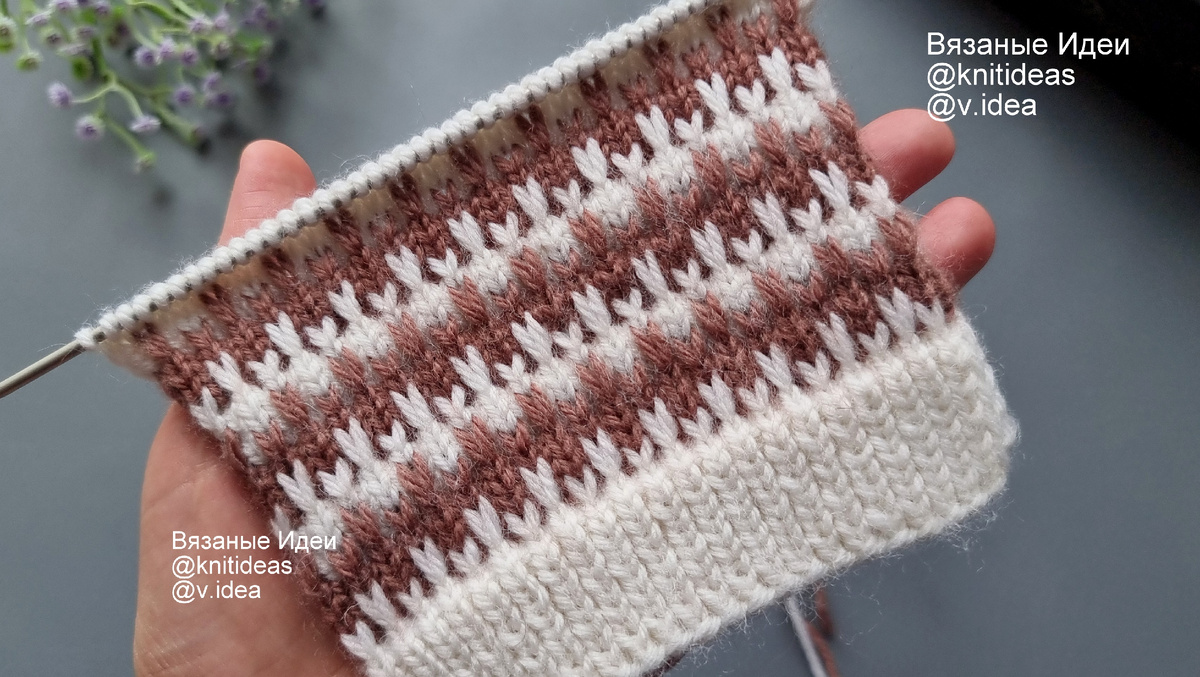 Всем привет! Нашла очень красивый узор и сегодня поделюсь с Вами описанием и схемой. Узор вяжется в технике ленивого жаккарда, цвет меняется через каждые шесть рядов. Здесь даже присутствует эффект градиента за счет снятых петель. Полотно получается очень плотное и изделие таким узором должно получиться очень теплое. Раппорт 4 петли и 12 рядов Внимание! При копировании и публикации моих материалов на других ресурсах указывайте активную ссылку на источник: канал Вязаные Идеи Описание узора для поворотных рядов: Количество петель кратно 4 +3 + 2 кром. 1 ряд (бел. цвет): лицевые петли 2 ряд (бел. цвет): изнаночные петли 3 ряд (кор.цвет): кром, *1 лиц, 1 п. снять(нить за раб)*, 1 лиц, кром 4 ряд и все четные ряды по рисунку: изнаночные петли провязывать изнаночными, снятые петли - снимать(нить перед раб) 5 ряд (кор. цвет): кром, *3 лиц, 1 п. снять(нить за раб)*, 3 лиц, кром 7 ряд (кор. цвет): лицевые 9 ряд (бел. цвет): кром, *1 лиц, 1 п. снять(нить за раб)*, 1 лиц, кром 11 ряд (бел. цвет