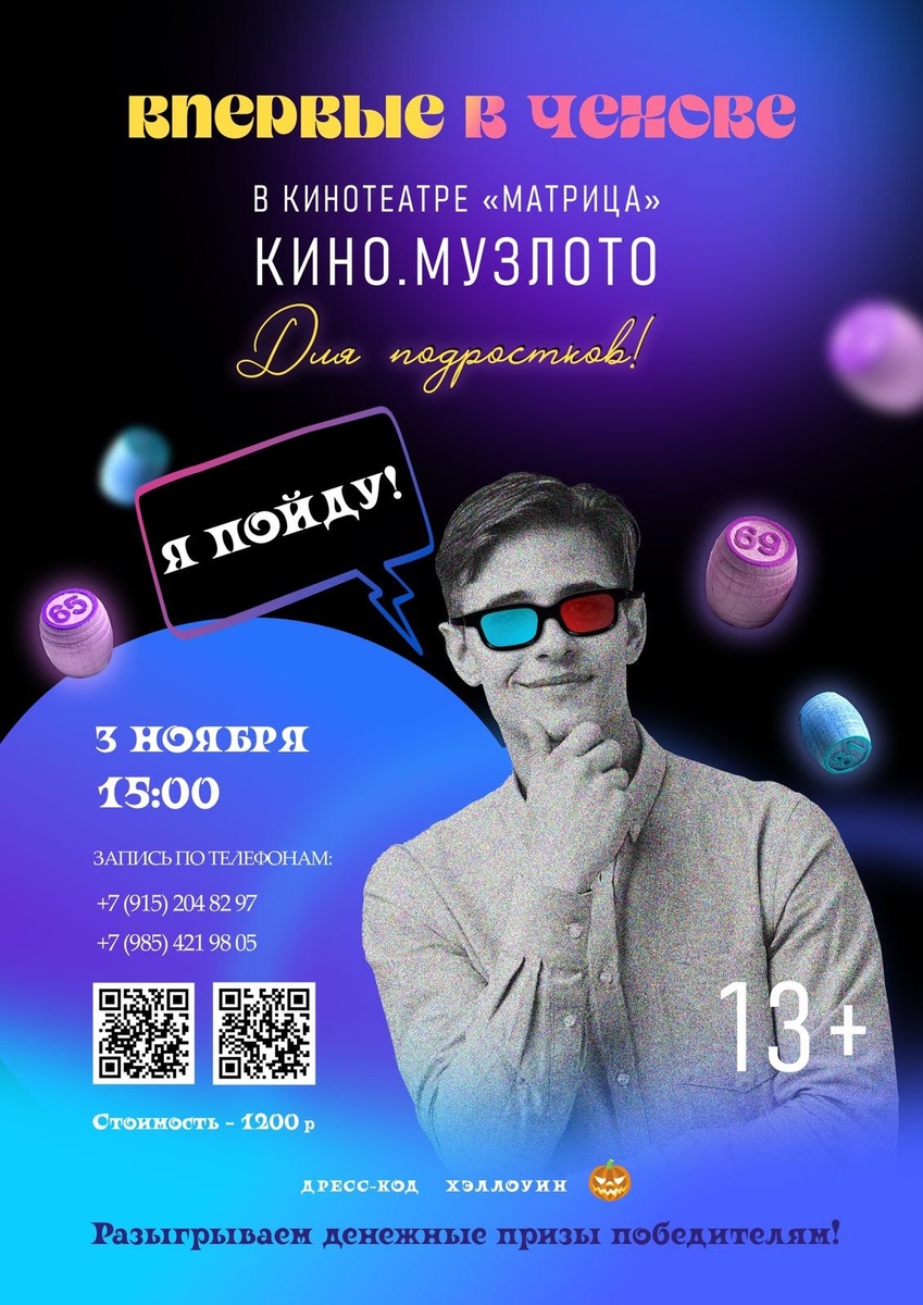 ✨ КИНО. МузЛОТО. Для подростков! 😱😋ВАУ! ТАКОГО ЕЩЁ НЕ БЫЛО ! Всего 80 мест в одном из залов кинотеатра «Матрица»! Играем с ПОДРОСТКАМИ в ЛОТО с бочонками, на карточках - популярные песни и фильмы, на экране - тоже, зачеркиваем в карточках👌 Наслаждаемся любимыми фрагментами, подпеваем, вспоминаем, заряжаемся друг от друга выходным настроением, ВЕЗУНЧИКИ - выигрывают денежные ПРИЗЫ! 👻 Поддержим дресс код в стиле Хэллоуин, - будет фотограф 📸 Продолжительность: 1,5 часа Ждем ❣️ 🚫 Возраст: 13+ 📆 03.11.2025 🕛 15:00 🏢 Кинотеатр «Матрица» г. Чехов 📍 г. Чехов, ул. Московская, вл.96 (ТЦ Карнавал) 💰 Цена: 1200 ₽ 🔗 Записаться: https://wa.me/79152048297 ⭐Поддержать канал голосом ✅ Мероприятия Чехов https://dzen.ru/id/66cc4b48e9ef144699238a51 http://vk.com/chekhov_events http://dzen.ru/chekhov_events