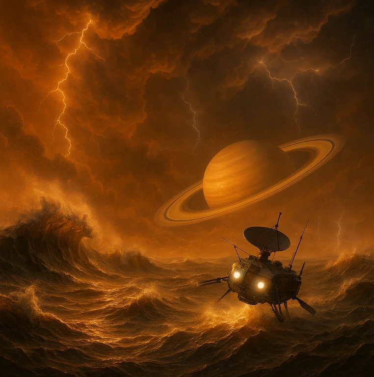 Оранжевое небо спутника Сатурна, под которым бушует метановый шторм. Волны из жидкого углеводорода вспениваются, отражая свет колец Сатурна, видимых на горизонте. На переднем плане — исследовательский зонд с антеннами, борющийся с ветром и волнами.
