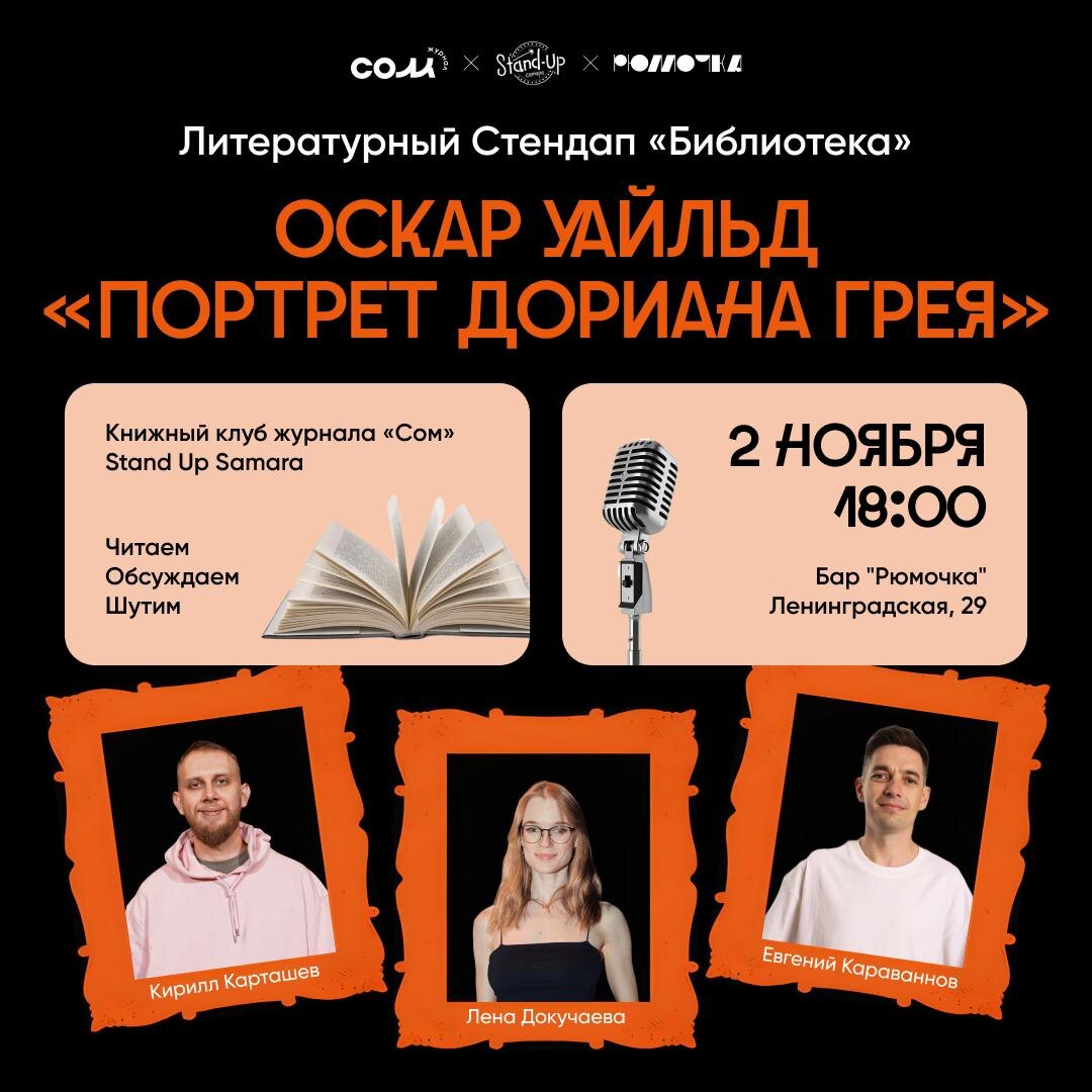 Литературный стендап «Библиотека»: Оскар Уальд «Портрет Дориана Грея» Первым ноябрьским воскресеньем встречаемся, чтобы обсудить самые безнравственный и единственных из напечатанных роман Оскара Уальда «Портрет Дориана Грея» 📚🕯 Ведущие – самарские стендап-комики Кирилл Карташев и Евгений Караваннов и, традиционно, Лена Докучаева — литературовед и главред журнала «Сом». Лена отвечает за историко-литературное сопровождение вечера, а парни — за смех и улыбки гостей. ➡️ Читаем, обсуждаем и шутим 2 ноября в 18:00 в баре «Рюмочка». ⏩Билеты — 400 рублей 📝 Гарантируем: даже те, кто не читал, получат удовольствие от вечера 📖 #сом_книжный