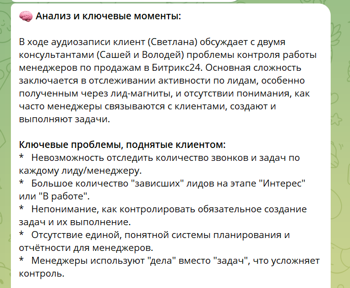 Вернулся я с небольшого отпуска: гора голосовых заметок, аудио из чатов, записи встреч с клиентами. А еще несколько больших проектов, где нужно переслушать часовые встречи с клиентами, чтобы быть в курсе и понять какие договоренности, сроки и тд. Знакомо? Пытался найти решение, но всё было не удобно или дорого. Хочется же хорошо и дешево, а лучше бесплатно) В один момент мне это окончательно надоело и я разработал бота-помощника Он появился, чтобы закрыть мою личную боль, а теперь им пользуются мои друзья и несколько десятков клиентов. Поэтому я решил рассказать про него вам, может быть он будет полезен. Чем же бот трансрибации аудио в текст может быть полезен? У меня лично несколько сценариев его использования 1. Встречи с клиентами Встретился с клиентом в телемосте, записал разговор, закинул в бота файл записи (если большой размер, то загрузил на Яндекс Диск и скинул ссылку), бот выдал в текстом файле с таймкодами и со спикерами расшифровку разговора и сделал анализ (заключение) исхо